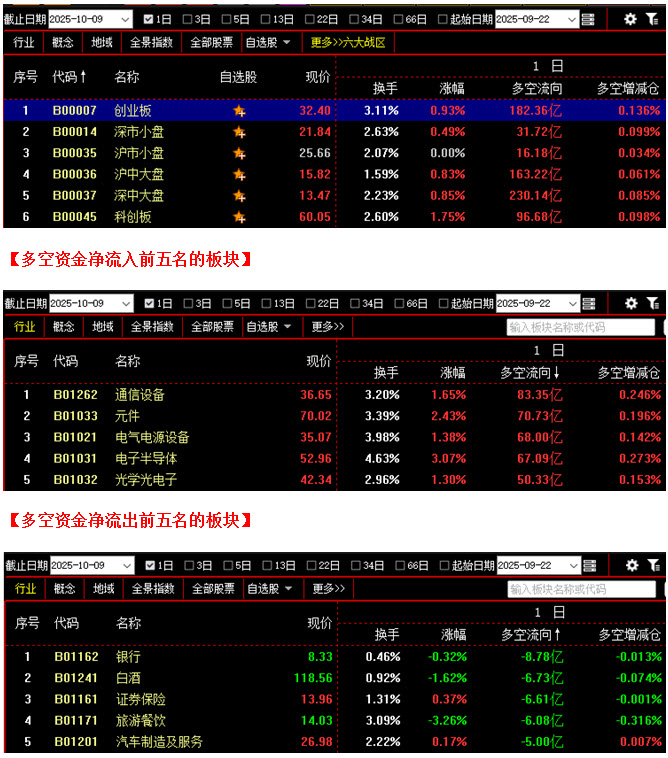 从板块资金动向数据来看,截止到今日午间收盘时,在资金流入榜上,通信设备板块以83.35亿的资金流入额位居榜首;其次是元件板块资金流入70.73亿;此外,电气电源设备板块、电子半导体板块、光学光电子板块也都相继上榜,三个板块的资金流入额分别为68.00亿、67.09亿、50.33亿;再看资金流出榜银行板块引领做空,资金流出8.78亿;其次是白酒板块,资金流出6.73亿;此外,证券保险板块、旅游餐饮板块汽车制造及服务板块的资金流出额也都相对较多,分列资金流出榜第三到第五名位置。综合比较后可知,今日上午不仅通信设备板块资金流入高达83亿,元件、电气电源设备、电子半导体、光学光电子等板块的资金流入额也都在50亿之上,场内热点不断涌现,多方人气继续维持在较高水平,仅半天时间,资金流入超过10亿的板块就达到19个;反观空方阵营,虽然银行、白酒、证券保险等权重板块纷纷出现在资金流出榜前列,但各板块的资金流出额均不足9亿,整体抛压并不是很大。可见今日上午资金明显以流入为主,多方力量远远强于空方,说明多数投资者后市行情依然十分看好。在这种氛围下,行情很可能会延续现有的强势格局,继续向上攀升。建议大家关注近期有资金连续加仓且股价短期运行趋势保持向上的强势个股,择机逢低介入。
