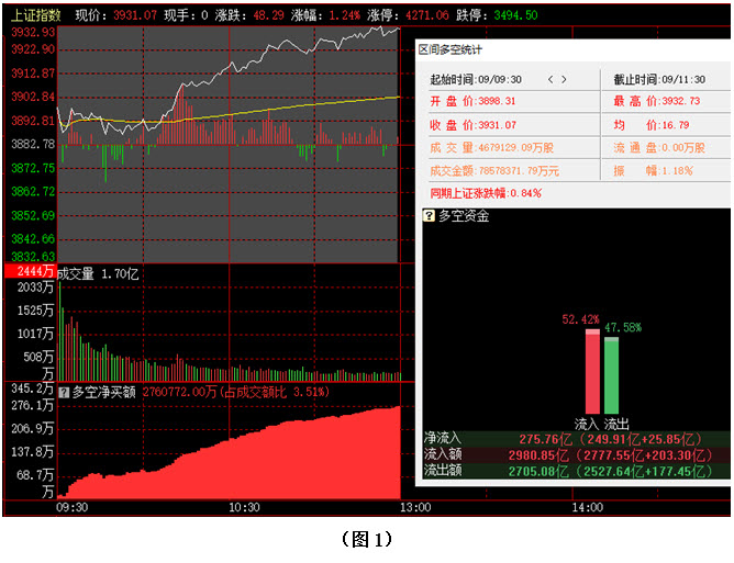 今日早间大盘虽高开在3898点,但并未直接冲破3900点整数关口,而是先小幅回探整理,10点后市场再度拉升,不仅轻松跃过3900点,而且不断向上拓展空间,至中午收盘时,指数位于3931点。从日K线图上看,今天上午大盘延续了节前的连续上攻走势,指数终于突破了8月26日之后震荡区间的上沿位置,并继续上扬,再创新高,市场短期强势格局十分明显,后市或有逐步向4000点大关逼近的可能。从下方的多空资金来看,早间开盘后,多方就占据优势,随后资金持续流入。截止到中午收盘时,沪市当中多方力量高于空方超过4个百分点,资金流入270多亿。从六大战区的情况分别来看,截止到今日中午收盘时,六个战区均为资金流入状态,其中不仅沪中大盘战区与创业板战区资金流入双双超过160亿,深中大盘战区的资金流入额更是高达230亿。可见今日上午各战区均有资金积极进场加仓,多方后续力量依然十分充足。在这种情况下,行情很可能会站稳在3900点整数关口之上,并继续向上发起冲击。建议大家紧跟资金步伐,积极优选个股,及时加仓做多。