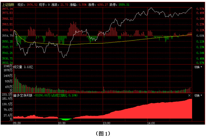 如图1所示,今日早间开盘后不久,大盘就出现下探,好在幅度不大,指数很快就在3940点附近获得支撑,并进行了一番震荡整固。10点45分左右,市场开始逐步向上回升,虽然接近3980点时,上方阻力有所显现,但大盘并未快速回落,而是基本保持在3970点上方,最终以3976点收盘。从下方的多空资金来看,早间开盘后,多方率先占据优势,可是资金进场并不流畅,盘中资金更是一度翻绿,但10点45分之后,随着大盘逐步回升,资金开始持续进场,多方力量越来越强。可见今日上午多空双方争夺还较为激烈,但到下午收盘时,多方优势已经十分明显。说明目前多数投资者的做多信心依然较足,所以即便大盘出现回落,场内也没有出现大面积恐慌。在这种情况下,空方就难以持续施压,行情回探往往较为温和,市场短期向上的趋势也就不会出现根本性改变,后市仍有继续上行的可能。故此建议大家在盘中不要盲目追涨杀跌,可关注近期资金明显以流入为主的个股,在行情震荡过程中逢低逐步吸纳。