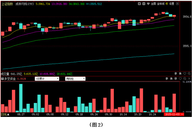再看图2,今日大盘虽一度跌至5日成本均线下方,但并没有持续下挫,多方经过反击后不仅夺回5日成本均线,而且指数还继续向上小幅拉升,最终以阳线报收,可见目前市场短期走势依然处于强势格局当中。从下方的多空资金来看,今日多空资金为流入状态,且资金流入量超过了上周四与上周五两天资金流出量的总和,说明近期行情虽有反复,但整体上资金仍是以流入为主。这种情况显然对多方更为有利。建议大家密切关注场内多空资金的进出情况以及4000点整数关口附近的压力情况,如果多方后续力量不断跟上,行情轻松跃上4000点关口,则说明经过一番震荡整固后,4000点处的压力已经明显减弱,后市将有望进一步向上攀升;反之,若是多方后续力量不足,大盘迟迟无法重返4000点上方,那么行情很可能会再度出现回探。