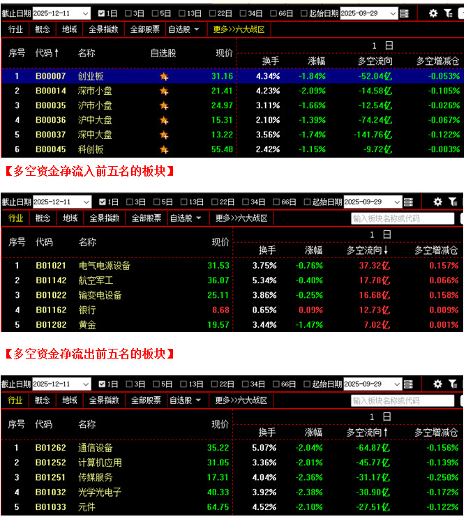 从板块资金动向数据来看,截止到今日收盘时,在资金流入榜上,电气电源设备板块以37.32亿的资金流入额位居榜首;其次是航空军工板块,资金流入17.78亿;此外,输变电设备板块、银行板块、黄金板块的资金流入额也都相对较多,分列资金流入榜第三到第五名位置;再看资金流出榜,通信设备板块引领做空,资金流出64.87亿;其次是计算机应用板块,资金流出45.77亿;此外,传媒服务板块、光学光电子板块、元件板块也都相继上榜,三个板块的资金流出额分别为31.17亿、30.90亿、27.51亿。综合比较后可知,今日不仅通信设备板块资金流出高达64亿,计算机应用、传媒服务、光学光电子、元件等科技类板块也在联手大幅做空,使得场内恐慌性抛盘不断涌出,多方人气快速下降;反观多方阵营,虽然电气电源设备板块资金流入超过35亿,同时输变电设备板块、航空军工板块、以及银行板块的资金流入额也都在10亿之上,但与空方力量相比,整体上攻力度明显不足。从六大战区的情况分别来看,截止到今日收盘时,六个战区均为资金流出状态,其中不仅创业板战区与沪中大盘战区资金流出双双超过50亿,深中大盘战区的资金流出额更是达到141亿可见今日空方全面施压,各战区均有资金出逃,说明由于大盘迟迟无法形成有力上攻,多方人气已难以聚拢,所以当行情再次回落时,承接盘明显减少。在这种情况下,如果空方连续施压,市场很可能会出现一波加速下探。建议大家控制好仓位,谨慎操作