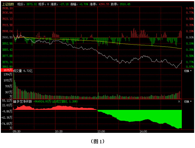 如图1所示,今日早间大盘很快就再次跌破3900点整数关口,随后指数逐步震荡下行,多方却迟迟没有进行像样的反击,午后市场表现依然疲软,大盘出现进一步下挫,指数最终以3873点收盘。从下方的多空资金来看,早间开盘后,多方率先占据优势,但资金进场的持续性较差,且随着大盘逐步下探,场内抛压逐渐增大,以致临近中午收盘时,资金出现由红翻绿,午后空方力量更是不断加强。可见今日上午还曾有资金进场试图抄底,但到了下午多方已基本放弃防御,恐慌性抛盘开始不断涌出,导致大盘下跌幅度越来越大。这就意味着,行情在3900点一带经过多次反复之后,最终还是选择了向下。建议大家控制好仓位,同时密切关注3860点附近的支撑情况,若该位置轻易失守,后市很有可能会到3800点附近去寻求支撑。