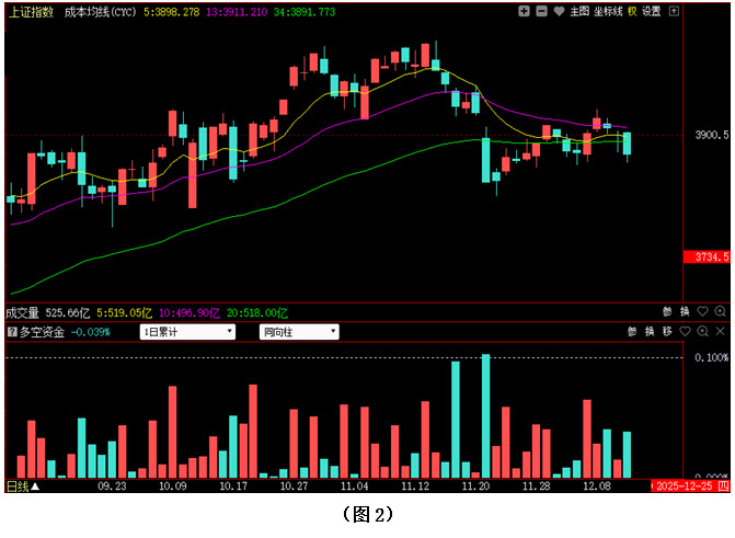 再看图2,今日大盘不仅重新回落到3900点整数关口下方,而且又一次跌破了5日与34日两条重要成本均线,指数不断下探,最终以阴线报收。从下方的多空资金来看,今日多空资金为流出状态,且资金流出量明显超过了昨日的资金流入量,说明多方的后续力量未能及时跟上,而空方则再次加大了施压力度。目前看,经过连续三天的回落,上周五与本周一的两根阳线已被完全吞没,大盘上方再次面临着多条重要成本均线以及3900点整数关口的重重压制。这就意味着市场的短期反弹已经失败,追涨资金多数被套。接下来多方若想再度上攻,不少投资者必然会心有余悸,行情反弹的难度将比上周五大幅增加,所以市场有可能会继续向下回落,到更低的位置去寻求支撑。建议大家在控制好仓位的同时,密切关注多空资金的进出情况,在多方资金没有连续大幅回流之前,不要急于抄底