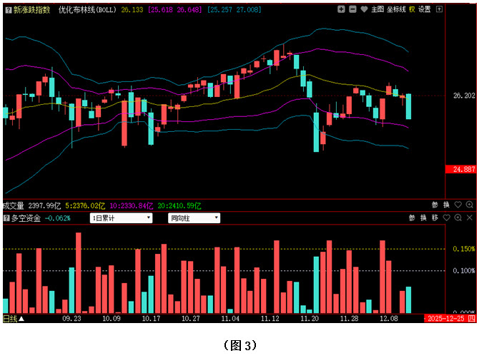 今日两市上涨个股共1033只,其中涨幅超过3%的个股306只,涨幅在9.9%以上的个股52只;下跌个股共4378只,其中跌幅超过3%的个股1070只,跌幅在9.9%以上的个股24只。图3所示为指南针特有的0Z指数K线图,从图中可以看到,今日0Z指数再次跌破优化布林中轨,并不断下挫,最终收出一根中阴线,不仅收盘位置再次回落至优化布林下紫线附近,而且上周五的阳线实体也已被完全吞没。可见今日场内多数个股都出现了明显下跌,以致上周五与本周一的反弹成果已荡然无存,市场整体走势再度转弱。从下方的多空资金来看,今日多空资金为流出状态,且资金流出量超过昨日资金流入量,说明场内抛压再度增大。在这种情况下,一旦多方无法及时反击,空方连续施压,行情就很可能会出现加速下探。建议大家控制好仓位,保持谨慎。
