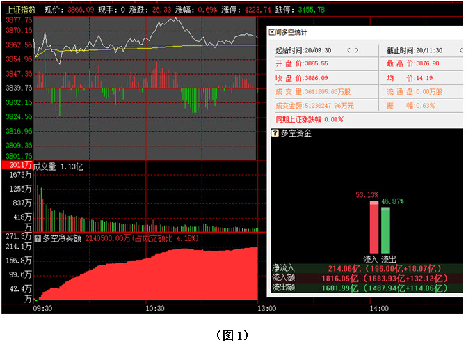 今日早间大盘高开,随后市场围绕着3865点窄幅震荡整理,至中午收盘时,指数位于3866点。从日K线图上看,今天上午大盘虽高开在13日成本均线上方,但明显受到5日成本均线压制,指数在13日成本均线与5日成本均线之间的狭小夹缝中艰难运行,等待着后市给出更为明确的方向。从下方的多空资金来看,早间开盘后不久,多方就占据优势,随后资金持续流入。截止到中午收盘时,沪市当中多方力量高于空方超过6个百分点,资金流入210多亿。六大战区的情况分别来看,截止到今日中午收盘时,六个战区均为资金流入状态,其中不仅沪中大盘战区与深中大盘战区资金流入双双超过120亿,创业板战区的资金流入额高达179亿。可见今日上午多方全面反击,各战区均有资金快速回流。但即便如此,周五的阴线也尚未被多方完全吞没,所以行情若想重新转强并继续上攻,多方的后续力量还需不断跟上,否则短期反弹之后,市场很可能还会有继续下探的动作。建议大家控制好仓位,不要频繁追涨杀跌,可关注前期调整较为充分且近期有资金连续回流的个股,逢低吸纳。