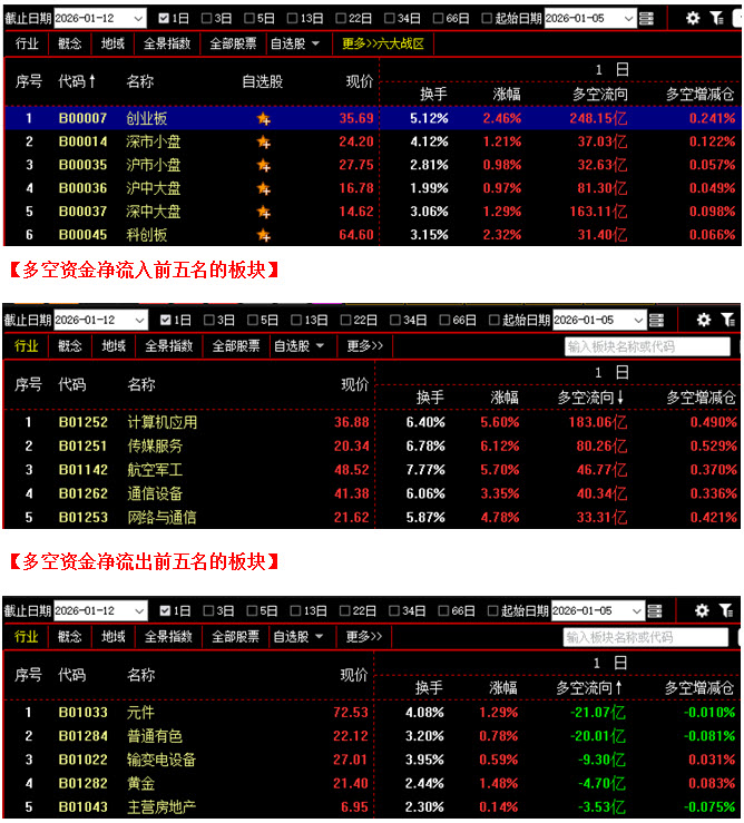 从板块资金动向数据来看,截止到今日午间收盘时,在资金流入榜上,计算机应用板块以183.06亿的资金流入额位居榜首;其次是传媒服务板块,资金流入80.26亿;此外,航空军工板块、通信设备板块、网络与通信板块也都相继上榜,三个板块的资金流入额分别为46.77亿、40.34亿、33.31亿;再看资金流出榜,元件板块引领做空,资金流出21.07亿;其次是普通有色板块,资金流出20.01亿;此外,输变电设备板块、黄金板块、主营房地产板块的资金流出额也都相对较多,分列资金流出榜第三到第五名位置。综合比较后可知,今日上午不仅计算机应用板块资金流入高达183亿,传媒服务、航空军工、通信设备等板块的资金流入额也都在40亿之上,场内热点持续性较强,多方人气进一步提升;反观空方阵营,虽然元件板块与普通有色板块资金流出双双超过20亿,但与多方力量相比,整体抛压依然较小。可见今日上午资金还是以流入为主,多方力量明显强于空方,说明随着大盘不断攀升,投资者的做多热情也在持续高涨。在这种氛围下,空方暂时很难形成连续大幅施压,所以行情迟迟无法出现回探,市场在资金的推动下继续向上飙升。不过需要注意的是,从2025年12月17日至今,大盘已经连续上涨了300点多,短期回探随时可能出现。故此建议大家不要盲目追涨,可关注近期有资金连续加仓且短期趋势保持向上的个股,待行情出现回探时逢低择机吸纳。
