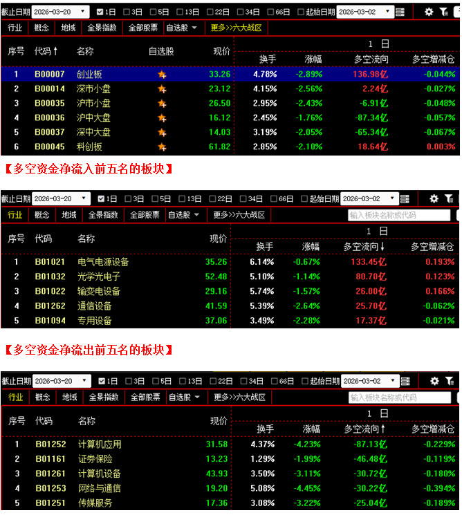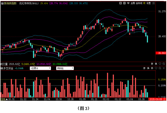再看图2,今日大盘继续向下回落,不仅4000点整数关口被空方轻松击穿,而且1月5日的向上跳空缺口也已被快速回补,如此一来,2026年前两个月的涨幅就已经被完全跌回,目前行情仍处在加速下探过程当中,市场短期走势明显偏弱,底部位置尚不明朗。从下方的多空资金来看,今日多空资金仍为流出状态,虽资金流出量较昨日略有减少,但资金的连续出逃说明场内的恐慌情绪并没有减弱,所以场外资金大多处于观望当中,不愿轻易进场抄底。不过由于自3月12日以来,大盘已经连续回落了近180点,短期下跌速度偏快,所以如果下周初市场出现惯性下探,在3930点附近很有可能会遇到支撑,并出现一波像样的反弹。
