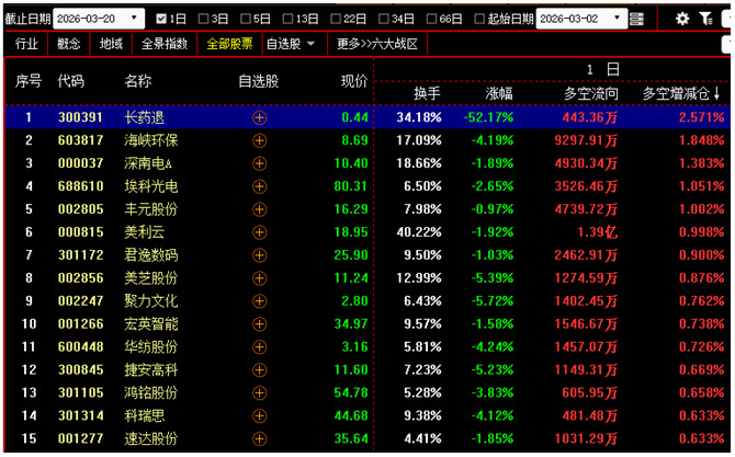 【今日多空资金增仓前200名中涨幅最小的15只个股】