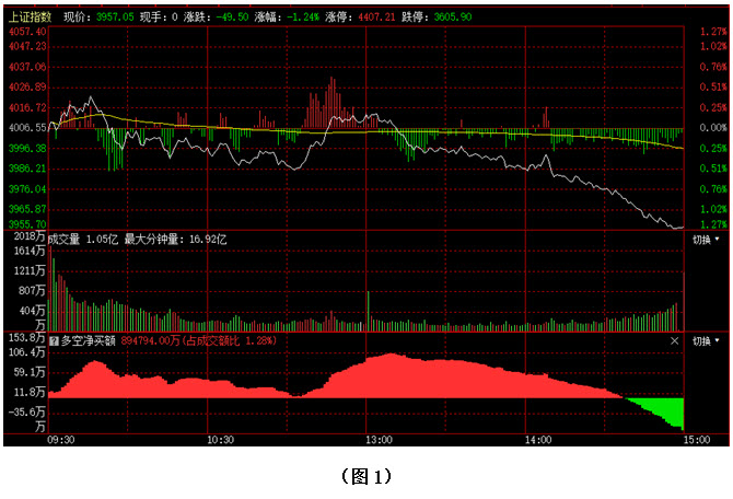 如图1所示,今日早间大盘试图上攻,可惜市场很快就在4020点附近遇阻回落,虽然指数下探至3980点附近获得支撑,并出现了一波快速反弹,但仍无法形成持续上攻,午后大盘不仅再度跌破4000点整数关口,而且还跌破了早间低点,并在尾盘加速下探,指数最终以3957点收盘。从下方的多空资金来看,早间开盘后,多方率先占据优势,上午大盘下探过程中,场内抛压虽一度增大,但资金始终保持着翻红状态,所以临近中午时,才会出现一波快速反弹,可是到了下午,大盘再次下探时,由于下跌幅度越来越大,抛盘越来越多,资金最终由红翻绿。可见今日多方曾两次试图向上反击,但均无功而返,导致4000点整数关口失守,投资者的做多信心进一步下降。在这种情况下,行情或仍有惯性下探的可能,但由于近期市场连续下挫,速度较快,所以短期反弹随时可能出现。建议仓位较重的投资者目前不要盲目杀跌,可等待反弹后再根据手中个股情况逢高减仓;而仓位较轻的投资者则可关注近期资金流出较少且股价中期上涨趋势并未改变的个股,逢低逐步吸纳。