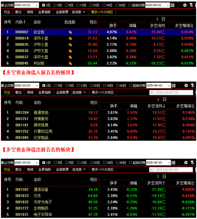 从板块资金动向数据来看,截止到今日收盘时,在资金流入榜上,普通有色板块以18.51亿的资金流入额位居榜首;其次是传媒服务板块,资金流入17.67亿;此外,煤炭炼焦板块、计算机应用板块、化学制品板块的资金流入额也都相对较多,分列资金流入榜第三到第五名位置;再看资金流出榜,通信设备板块引领做空,资金流出21.99亿;其次是元件板块,资金流出19.19亿;此外,光学光电子板块、生物制药板块、电子半导体板块也都相继上榜,三个板块的资金流出额分别为16.66亿、12.10亿、11.93亿。综合比较后可知,今日不仅通信设备板块资金流出超过20亿,而且元件、光学光电子、电子半导体等板块的资金流出额也都在10亿之上,科技类板块的集体做空对场内多方人气形成明显压制;反观多方阵营,普通有色、传媒服务、煤炭炼焦、计算机应用等板块资金流入均超过15亿,虽然有色、煤炭等权重板块的做多对大盘起到稳定作用,但更值得一提的则是计算机应用板块,该板块在中午收盘时还处于资金流出榜第五名的位置,而在下午两点半后却明显出现异动,以科大国创为首的多家公司纷纷出现资金快速抢筹,若明日计算机应用板块的这种强劲势头可以得到延续,则有可能会对其他科技类板块形成带动作用。从六大战区的情况分别来看,截止到今日收盘时,只有科创板战区有26亿资金流出;其余五个战区则均为资金流入状态,其中创业板战区资金流入最多,达到25亿。可见今日多方力量最终占据了优势,尽管整体上看资金流入的数额并不是很多,但与中午收盘时多数战区均资金流出超过45亿的状态相比,显然是有多方主力在午后快速进场,方能扭转局面。这就说明虽然近期行情在3900点附近反复纠缠,导致投资者的做多信心出现下降,但多方主力并不愿就此放弃,所以接下来只要多方后续力量及时跟上,市场就仍有向上攀升的可能。建议大家控制好仓位,同时密切关注场内多空资金的进出情况,如果多方能够持续发力,大盘轻松向上创出新高,则可及时优选个股,跟进做多;反之,若多方后续无力,3900点整数关口再度失守,操作上必须格外谨慎。