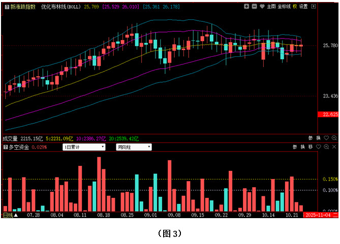 再看图2,今日大盘下探到5日成本均线附近获得支撑,随后指数向上回升,收出阳线,且收盘位置较前两天略有抬高,可见市场短期走势依然相对较强。从下方的多空资金来看,今日多空资金为流出状态,不过资金流出量依然很小,这就说明虽然近期大盘在3900点整数关口附近反复震荡,但始终没有引起大面积恐慌。在这种情况下,行情就具备了进一步上攻的潜质。接下来只要多方及时发力,市场就有望突破10月9日的3936高点,继续向上攀升。建议大家在控制好仓位的同时,可关注近期出现过快速回调的热门个股,若这些个股在黄金坑超跌信号出现后,有资金连续回流,则可逢低吸纳。