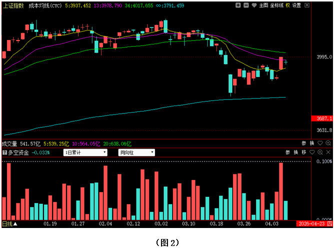 再看图2,今日大盘直接低开在13日成本均线下方,且盘中向上回升时明显受到13日成本均线压制,好在指数全天运行在5日成本均线上方,市场短期走势仍相对较强,所以接下来只要多方及时发力,行情就有望进一步好转。从下方的多空资金来看,今日多空资金为流出状态,但资金流出量远远小于昨日的资金流入量,说明昨日进场的资金大多仍沉淀在场内,继续对后市保持着看多态度。在这种情况下,市场下方就会有较强支持,所以只要空方无法连续施压,即便行情回探的幅度就不会过大。建议大家密切关注多空资金的进出情况以及5日成本均线对大盘的支撑情况,若指数保持在5日成本均线上方,多方继续发力,短期内大盘就有再次上冲4000点的可能;反之,如果空方连续施压,指数轻松击穿5日成本均线,大盘就有可能向下去回补4月8日的跳空缺口,操作上则需谨慎。