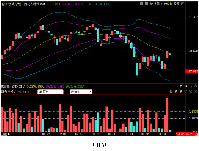 今日两市上涨个股共1115只,其中涨幅超过3%的个股326只,涨幅在9.9%以上的个股60只;下跌个股共4020只,其中跌幅超过3%的个股721只,跌幅在9.9%以上的个股11只。图3所示为指南针特有的0Z指数K线图,从图中可以看到,今日0Z指数同样低开,并再次跌至优化布林中轨下方。可见今日场内多数个股都出现了回探,虽没有将昨日涨幅完全吞没,但市场整体走势或有重新转弱的危险。从下方的多空资金来看,今天多空资金为流出状态,但资金流出量远远小于昨日的资金流入量,说明空方虽有施压,但抛压并不是很强。在这种情况下,只要空方无法连续施压,投资者的做多信心就不会大幅下降,届时一旦多方发力,行情就会有继续向上回升的可能。