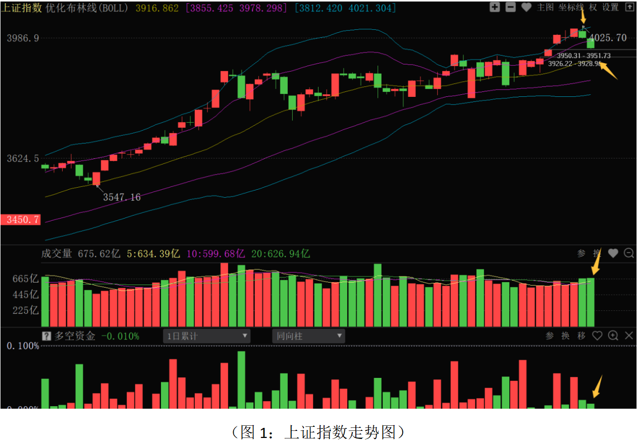 从上证指数走势来看:上周股指冲击4000点大关后再度回落,收盘收破4000点。对于市场的短期回落主要原因有以下几点:第一点,上周中美新一轮关税会谈结果出炉,美联储再度降息,叠加“十五五”规划建议的逐步落地,市场做多动能得到明显释放,股指一度上破优化布林线上轨和远离5日成本均线,技术上呈现一定的“超买”状态。第二点,三季报业绩集中披露,对于高估值,以及前期大涨的部分科技制造板块品种形成一定的承压,部分获利盘和解套盘抛压增加,加大个股和板块的分化。第三点,上周国内外多重重要事件落地之后,由于前三季度GDP增速为5.2%,全年完成5%的既定目标压力较小,四季度超预期政策出台和定调的可能性降低,新一轮政策预期可能会在12月份的中央政治局会议和中央经济工作会议上,市场再度进入政策真空期和期待期,资金观望态度有所增加。第四点,股指上攻4000点之后,技术上面临6124点和5178点连线的下降趋势线的压力,点位在4100-4200点一带,该位置是大趋势重要技术压力和心理压力位,需要超预期政策的强力指引和资金的合力进场。资金合力进场的契机,一个是内需消费超预期政策的指引,另外一个是科技制造板块对前期获利盘和解套盘充分消化之后。所以,结合政策面、资金面、技术面等维度的分析,市场在4000点位置反复震荡也是对经济政策基本面的正常反应。目前,股指跌破5日成本均线,短线走势有走弱的迹象。同时,10月24日、10月27日K线留有跳空缺口,对股指有一定的牵引,由于上周四、周五股指连续调整,盘中资金没有像样的回补,本周初股指仍有顺势下探的动能。重要支撑位置在13日成本均线和优化布林线中轨位置(3915点一带),该区域如果能够有效支撑,近期的冲高回落走势技术上可以认为是突破后的回抽整固走势,股指可能会围绕3900-4000点震荡,等待政策的进一步指引,投资者不宜过分恐慌,也不要过分纠结4000点的得失。从0Z指数走势来看:股指在中、短期成本均线上方强势震荡,走势总体强于沪深主要股指走势,尤其是上周五股指强势上涨,多空资金净流入215.66亿元,全市场上涨个股家数和下跌个股家数比超过2:1,股指震荡的同时个股相对活跃,资金对于前期涨幅小的消费、农业、化工等板块有一定的回补,从而对冲前期强势的科技成长、贵重金属、煤炭等板块回调带来的冲击,说明资金有一定的“高低切换”动作,低位或调整充分个股有阶段性的轮动机会。目前活跃市值(0AMV)受制于13日、34日成本均线和前期平台压力冲高震荡,叠加政策真空期阶段,市场难以形成普涨格局,股指继续围绕前期高点和筹码密集峰震荡的可能性较大。操作上应采取稳中有进的策略应对,总仓位控制在6-7成,底仓持股为主;浮动仓位可紧盯大盘关键位置资金流向低吸进场,适当参与结构性机会。