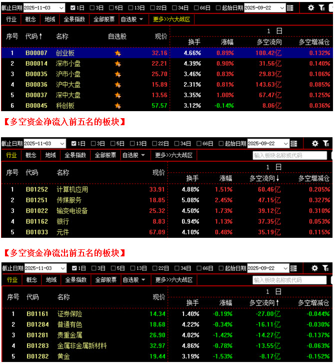 从板块资金动向数据来看,截止到今日收盘时,在资金流入榜上,计算机应用板块以60.46亿的资金流入额位居榜首;其次是传媒服务板块,资金流入47.15亿;此外,输变电设备板块、银行板块、元件板块也都相继上榜,三个板块的资金流入额分别为39.12亿、37.35亿、35.19亿;再看资金流出榜,证券保险板块引领做空,资金流出27.00亿;其次是普通有色板块,资金流出26.71亿;此外,贵重金属板块、金属非金属新材料板块、黄金板块的资金流出额也都相对较多,分列资金流出榜第三到第五名位置。综合比较后可知,今日不仅计算机应用板块资金流入超过60亿,传媒服务、输变电设备、元件等板块的资金流入额也都在35亿之上,投资者做多热情依然较高;同时银行板块也资金大幅流入37亿,对大盘起到稳定作用。反观空方阵营,除证券保险板块资金流出27亿之外,普通有色、贵重金属、金属非金属新材料、黄金等金属类板块也出现集体做空,但与多方力量相比,整体抛压相对较小。从六大战区的情况分别来看,截止到今日收盘时,六个战区均为资金流入状态,其中不仅创业板战区资金流入超过百亿,沪中大盘战区的资金流入额更是达到143亿。回顾午评数据可知,在中午收盘时,有部分战区为资金流出状态,但到全天收盘时,所有战区均为资金流入,且有两个战区资金流入达到百亿之上,可见午后多方力量有明显增强,从而打断了空方的进一步施压。说明目前场内多数投资者对后市依然较为看好,所以当抛压出现时,恐慌性抛盘相对较少,而当大盘向上回升时,则会有更多资金进场加仓。在这种情况下,后市将有望延续现有趋势,继续震荡上行。建议大家可在控制好仓位的同时,关注近期有资金连续流入且股价短期趋势保持向上的个股,逢低吸纳。