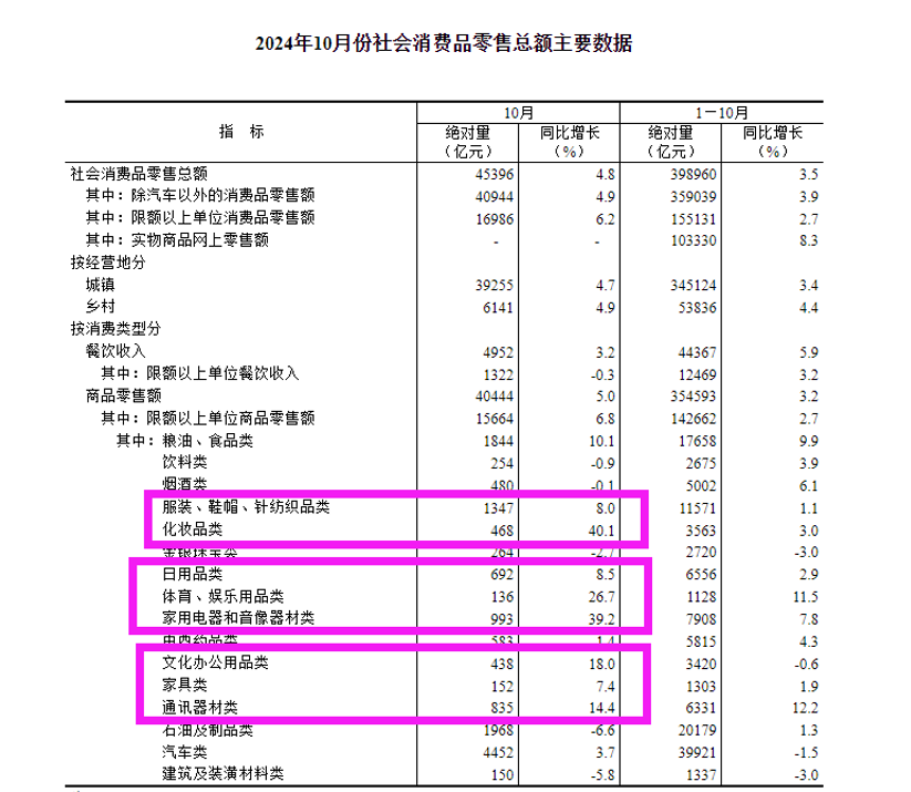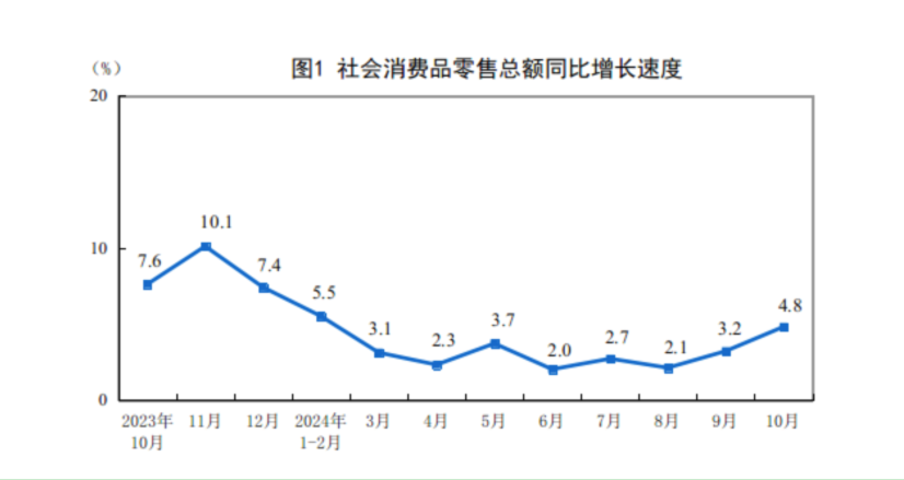 综合来看,10月份,随着前期存量政策的落实以及增量政策的持续推出,政策的效果在逐步显现。比如,在消费品以旧换新政策带动下,家用电器和音像器材、文化办公用品、家具、汽车等零售额都出现了较快增长。国家统计局新闻发言人付凌晖在介绍国民经济运行情况时表示:10月份国民经济运行稳中有进,主要指标明显回升,积极因素累积增多。下阶段,要加力推进一揽子增量政策落地落实,巩固和增强经济回升向好态势,努力完成全年经济社会发展目标任务。