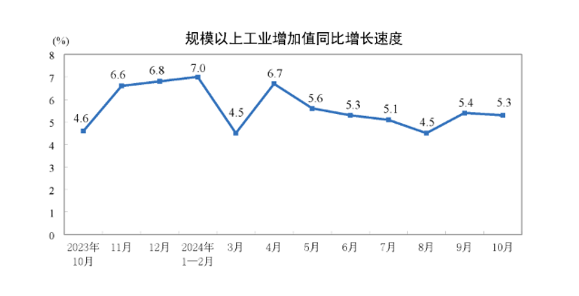 再看工业增加值的数据,10月份,规模以上工业增加值同比实际增长5.3%(增加值增速均为扣除价格因素的实际增长率)。从环比看,10月份,规模以上工业增加值比上月增长0.41%。分三大门类看,10月份,采矿业增加值同比增长4.6%,制造业增长5.4%,电力、热力、燃气及水生产和供应业增长5.4%。