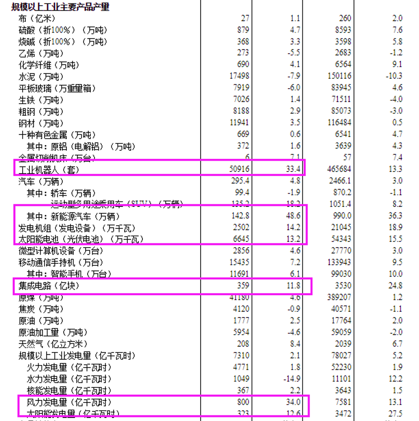 分产品看,10月份增长较快的行业有工业机器人增长33.4%,新能源汽车增长48.6%,风力发电量增长34%,发电机组增长14.2%,太阳能电池增长13.2%,集成电路增长11.8%。详见下图: