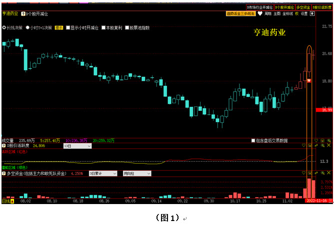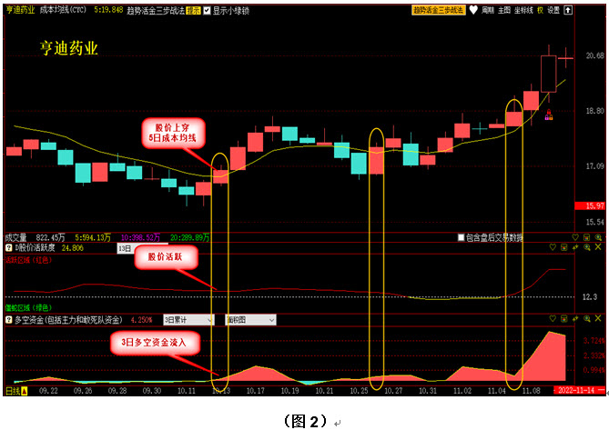 如图1所示,按照“趋势活金三步战法”,亨迪药业发出买入信号的时间是在2022年11月9日,看到信号之后,投资者可在当天收盘前或次日开盘后进场买入,从图中可以看到,所对应的股价大致在20元附近。而该股在2022年10月12日股价只有16.5元左右,之后在10月下旬的回探过程中,股价还一度回探至17元附近。可见,无论是2022年10月12日时的股价,还是10月下旬的回探时的股价,都明显低于2022年11月9日开仓信号出现后的价格。所以只要我们能够找到合理的方法,提前买入一些,我们的持股成本就会更低一些。