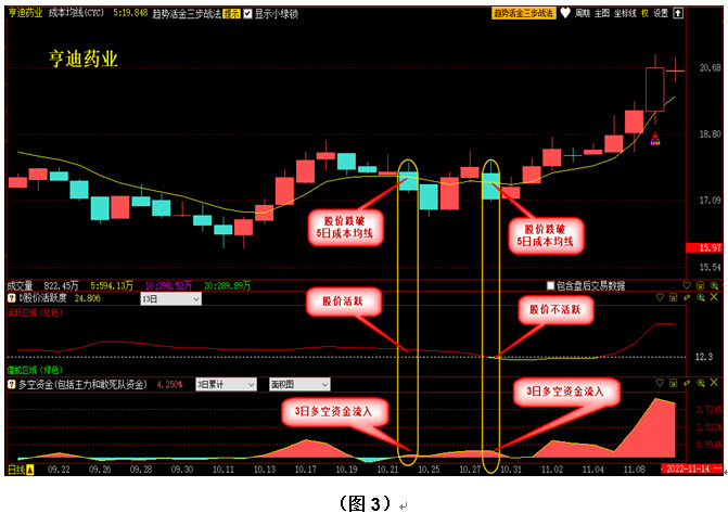 如图3所示,在2022年10月24日,亨迪药业因回调幅度加大,股价跌破5日成本均线,不过从下方另外两个指标来看,当天该股的股价仍处于红色活跃状态,且3日多空资金也为红色流入状态,这就说明三个条件中只有一个出现了变化,另外两个仍支持看多。所以我们不用将之前买入的所有仓位一举清空,只要减仓二分之一到三分之一即可。