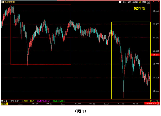 图1中所示为2021年11月1至2024年8月7日的0Z指数日K线走势图。相比上证指数来说,由于0Z指数采取的是等权算法,去除了权重板块对指数的影响,所以更能代表市场整体运行的真实情况。