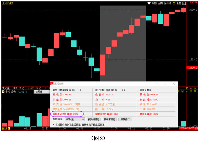 如图2所示,通过区间统计可知,在2024年2月6日至2024年2月23日期间,一共经历了8个交易日,大盘累计涨幅11.20%!对于指数来说,在那么短的时间内就取得了10%以上的上涨,应该说是比较少见的。
