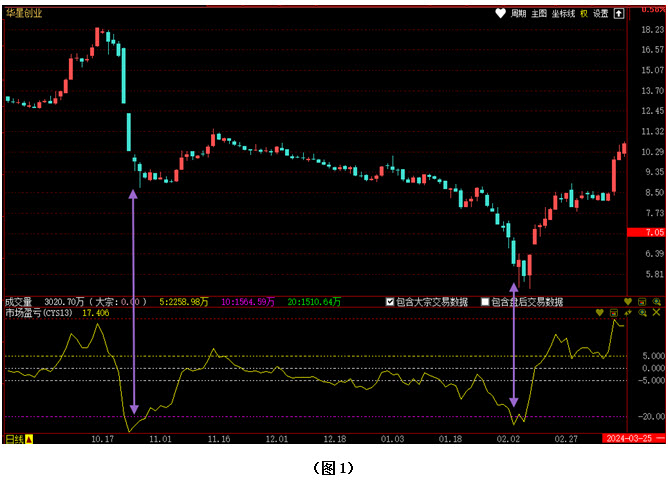 图1是华星创业从2023年9月13日至2024年3月13日的K线走势图,K线图下方为指标CYS13,我们看到在这半年的运行当中,该股下方的CYS13指标曾经两次跌至负20下方。CYS13跌到负20之下意味着在过去13个交易日内买入该股的投资者平均亏损超过20%!遵照“物极必反”的自然规律,此时个股存在着强烈的反弹要求,一旦股价回升,往往就会出现一波快速的上涨。由此我们可得到一个结论,就是当个股的CYS13跌到负20下方的时候,介入该股的投资者短期内被快速深度套牢,一方面场内投资者因亏损严重不愿继续割肉,而另一方面快速下跌带来了逢低介入的机会,此时如果有资金推动,股价极可能出现报复性反弹,所以如投资者遇到CYS13跌到负20之下的股票,可密切关注该股的多空资金变化情况了,那么应该看几日多空资金为好呢?见图2: