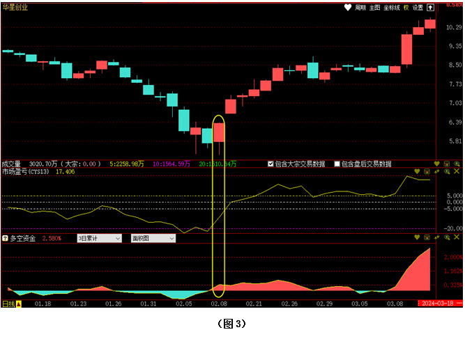 从图3中可以看到,由于2024年1月26日之后的连续下挫,该股的CYS13指标在2024年2月5日再度下探至-20之下。随后我们观察三日多空资金的变化,结果发现,在2024年2月8日,该股收出一根长阳,不仅CYS13指数回升到-20的上方,同时3日多空资金也出现翻红,说明有资金低位进场。故此我们可以及时进场参与做多。