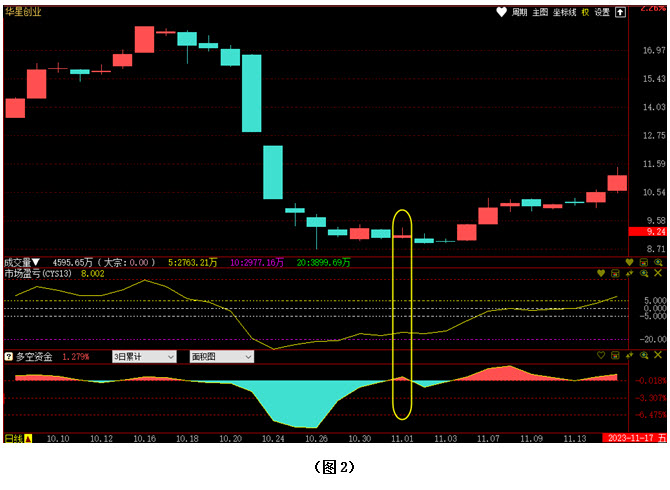 如图2所示,这是图1中华星创业在2023年10月18日之后的一次快速杀跌中,连续8根阴线,将股价直接从就由18元上方打落至9元附近,短期跌幅高达50%,到2023年10月24日该股的CYS13指标就已经探至-20之下,符合我们所说的超跌股特征。这时大家打开多空资金指标,并调整到3日多空资金。为什么要选择3日多空资金,而不是看1日多空资金或5日多空资金呢?道理其实很简单,首先股价反弹需要有资金的连续推动,如果只看1日多空资金翻红就冒然买入,一旦多方后续力量没有赶上,就会非常被动,甚至被套在下跌途中,所以我们需要稍微多看几天,这样才能确保资金的进场并非只是一时冲动;其次大家现在做的是超跌反弹,而在反弹爆发后,股价的短期上涨速度往往很快,如果我们看的时间过长,就有可能会错失在反弹初期买入的机会。故此将1日与5日折中一下,咱们就选择3日多空资金翻红作为对超跌股买入的参考依据。